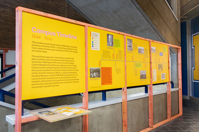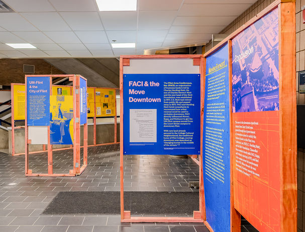 The mobile exhibition consisted of wall framing with printed panel that thoroughly explored the university's origins and urban renewal in Flint.